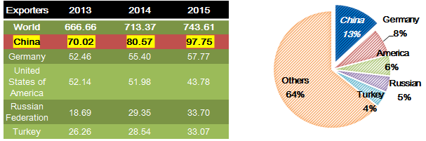 2015年埃及貿(mào)易進(jìn)口總額為743.61億美元,其中,中國對埃及出口97.75億美元,占比13%。是埃及第一大進(jìn)口來源國。