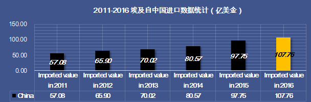 ?2016年,中國與埃及雙邊貨物進(jìn)出口額為113.25億美元,比去年同期(下同)下降12.03%。其中,中國對埃及出口107.76億美元,下降9.92%。受埃及實(shí)行進(jìn)口注冊制影響。