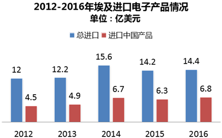 2012-2016的五年間,埃及電子消費(fèi)品的總進(jìn)口量雖在2015-2016年小幅下降,但中國產(chǎn)品的進(jìn)口額仍基本保持增幅狀態(tài)。