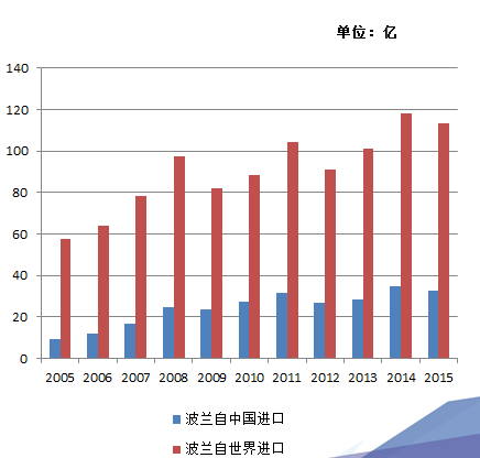 2015年波蘭貿(mào)易進(jìn)口總額為3841.57億美元,其中,中國對波出口536.4億美元,同 比去年增長約3.8%,中國成為波蘭第二大進(jìn)口來源國。