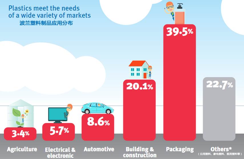 同時,波蘭本身擁有巨大的塑料消費能力,國內(nèi)兩大塑料消費領域分別是包裝行業(yè)和建筑業(yè)。2015年波蘭國內(nèi)的塑料消費已達到320萬噸,占整個歐洲市場的6.6%(4480萬噸),排名第六。隨著波蘭汽車和電子行業(yè)的發(fā)展,波蘭市場的塑料消費將進一步提升。