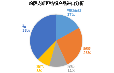 紡織類(lèi)產(chǎn)品進(jìn)口量約 10億 美金,自中國(guó)進(jìn)口紡織品占比 32.1%。哈薩克斯坦進(jìn)口紡織品以 鞋、服裝 類(lèi)居多。其次為 輔料面料、家紡、箱包。