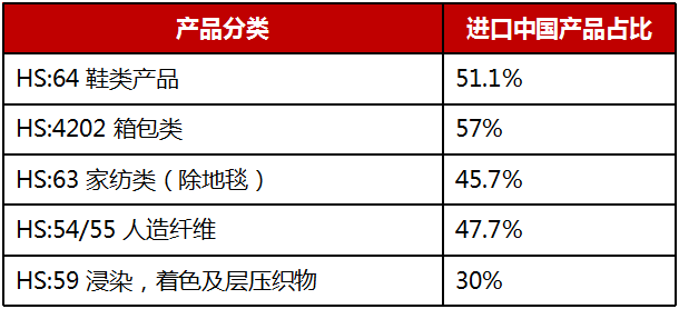 推薦產(chǎn)品:HS:64 鞋類(lèi)產(chǎn)品; HS:4202 箱包類(lèi); HS:63 家紡類(lèi)(除地毯); HS:54/55 人造纖維; HS:59 浸染,著色及層壓織物