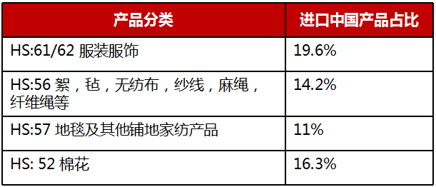 推薦產(chǎn)品:HS:61/62 服裝服飾;HS:56 絮,氈,無(wú)紡布,紗線(xiàn),麻繩,纖維繩等;HS:57 地毯及其他鋪地家紡產(chǎn)品;HS: 52 棉花