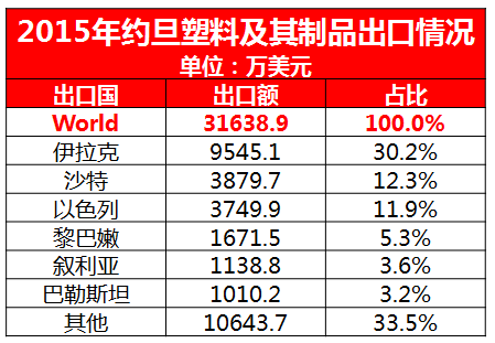 “塑料管材、家用塑料制品、農(nóng)用塑料制品”是約旦的主要生產(chǎn)和出口的塑料產(chǎn)品,主要出口市場為海灣地區(qū)國家,包括伊拉克、沙特、以色列、黎巴嫩、敘利亞、巴勒斯坦等。