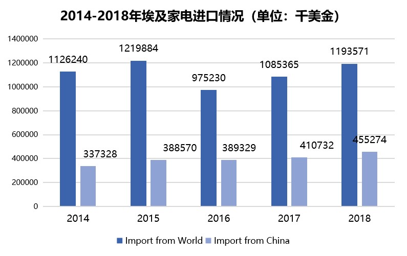 2018年埃及全球家電進(jìn)口額達(dá)11.93億美元。其中自中國進(jìn)口的家電占38.13%,約4.55億美元,是埃及家電第一進(jìn)口來源國。
