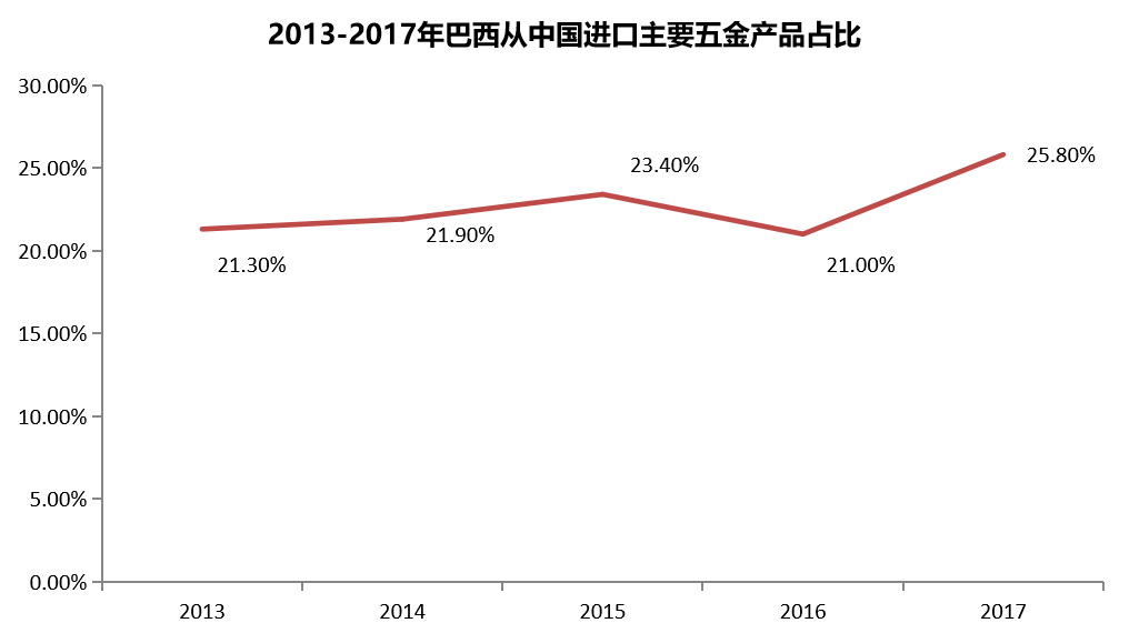 2013-2017年,巴西從中國(guó)進(jìn)口的主要五金產(chǎn)品占比基本保持逐年增加,2017年占比達(dá)到最高,達(dá)25.8%。