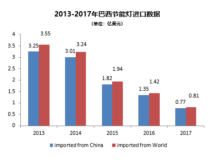 2017年巴西節(jié)能燈總進口額8100萬美元,從中國進口7700萬美元,占比95.1%。