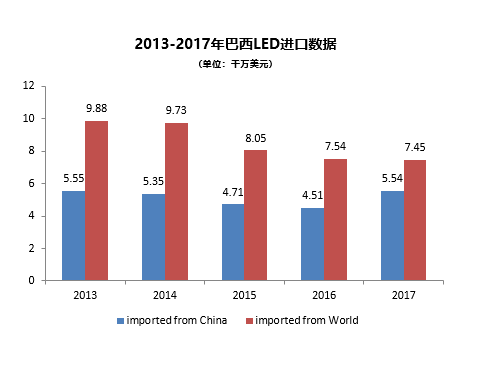 2017年巴西LED總進口額7450萬美元,從中國進口5540萬美元,占比74.4%。