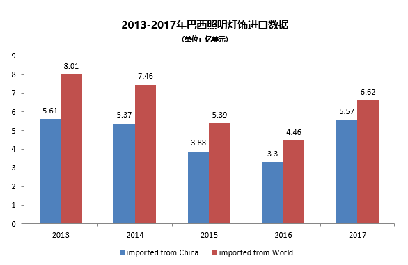 2017年巴西照明燈飾總進口額6.62億美元,從中國進口5.57億美元,占比84.1%。