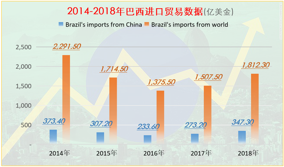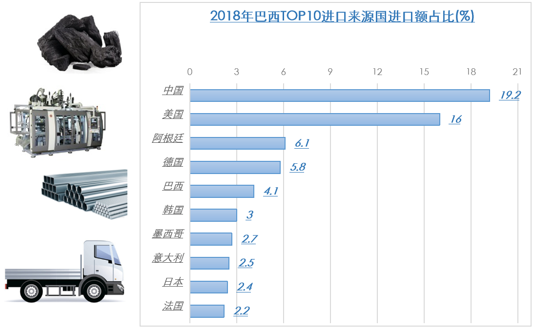 2018全年,巴西全球進口總額1,812.3億美元,增長20.2%;其中自中國進口額為347.3億美元,增長27.1%,占巴西自中國進口總額的19.2%。中國是巴西第一大進口來源國。