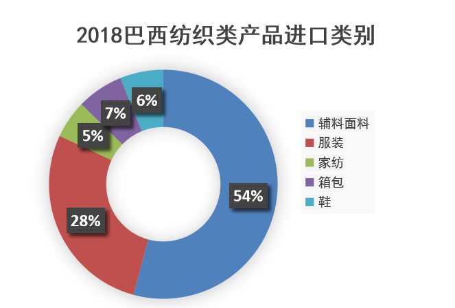巴西進口紡織類產(chǎn)品中,輔料面料占54%,服裝類占28%,鞋類占8%,箱包占7%,家紡類5%。
