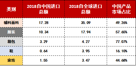 輔料面料:巴西是世界第二大粗斜紋布生產(chǎn)國,第三大針織布生產(chǎn)國,但是巴西化纖業(yè)薄弱,人造纖維貿(mào)易逆差大,聚酯纖維進口數(shù)量大。巴西進口中國輔料面料占比約為10%-50%,2018年自世界進口35.09億美元,其中中國輔料面料為17.28億美元,約占49.26%的巴西市場,主要進口絲綢、人造纖維、編織織物、人造短纖維等面輔料,分別占巴西總進口的94.37%,50%,93.96%和43.09%。