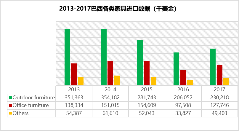 2017年巴西全球家具進(jìn)口額達(dá)7.83億美元。其中自中國進(jìn)口的家具占45.85%,約3.59億美元。