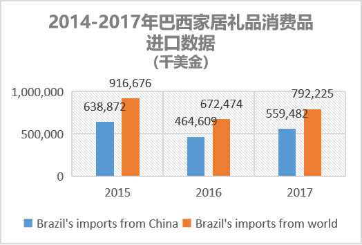 2017年巴西家居禮品及消費品總進(jìn)口額為7.92億美元,自中國進(jìn)口相關(guān)產(chǎn)品總金額高達(dá)5.59億美元,占比69.69%,是巴西家居禮品消費品的第一進(jìn)口來源國。
