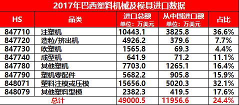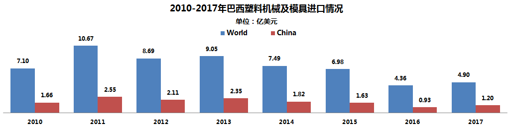 巴西是南美塑料機械的主要進口國之一,2017年進口規(guī)模達4.9億美元。巴西主要進口的塑料機械包括“注塑機、擠出機及其他塑機”,當?shù)厥袌鰧Α八芰夏>摺钡男枨笠彩挚捎^。2017年以前,巴西塑料行業(yè)受全國經(jīng)濟衰退的嚴重影響,自國外進口規(guī)模明顯減少。2017年整體經(jīng)濟開始恢復,塑料加工設備的進口規(guī)?;謴驮鲩L12.4%。目前中國是巴西塑料設備的第二大進口來源國,2017年巴西自中國進口額達到1.2億美元,市場占比24.4%。其中中國制造的“注塑機械和塑料模具”已在巴西當?shù)厝〉昧溯^高的市場認可度。