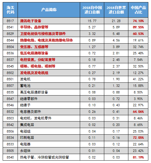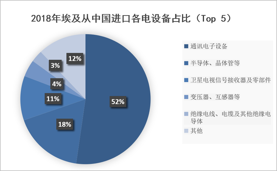 2018年埃及從中國(guó)進(jìn)口的電力設(shè)備中,通訊電子設(shè)備占比最多,占比52%,半導(dǎo)體、晶體管、衛(wèi)星電視信號(hào)接收器及零部件等分別排名二、三,占比18%和11%。
