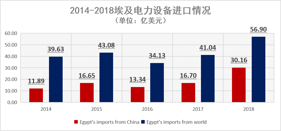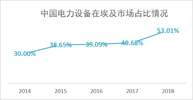 2018年中國(guó)電力設(shè)備在埃及市場(chǎng)占比創(chuàng)5年來(lái)的新高,占比達(dá)53.01%,較2014年增長(zhǎng)了70.7%。目前中國(guó)已成為埃及主要電力設(shè)備的第一進(jìn)口來(lái)源國(guó)。中國(guó)電力產(chǎn)品在價(jià)格和功能上也更適應(yīng)埃及目前的國(guó)情。
