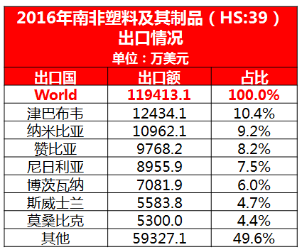 此外,南非是非洲主要的塑料出口國,每年都要出口大量塑料制品到周邊其他國家和地區(qū)。2016年南非塑料及其制品的出口額達到11.94億美元,同比增加13.8%。