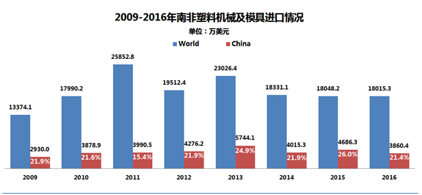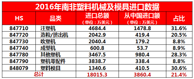 目前,中國的“注塑機、造粒/擠出機、其他塑機及塑料模具”在南非已經(jīng)取得了一定的市場份額,并獲得了足夠的認可。