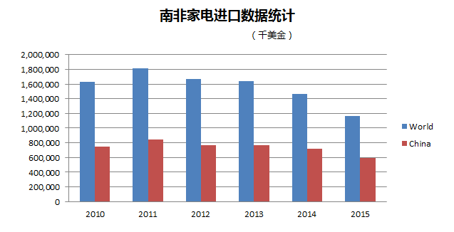 2015年中國(guó)家電出口額占南非總進(jìn)口的近60%。
