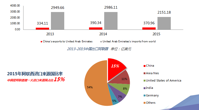 ? 2015年,阿聯(lián)酋總進(jìn)口額達(dá)2151.18億美元,中國(guó)是阿聯(lián)酋第一大進(jìn)口來(lái)源國(guó)(2013年第三大進(jìn)口來(lái)源國(guó)),中國(guó)出口阿聯(lián)酋總額達(dá)370.96億美元。