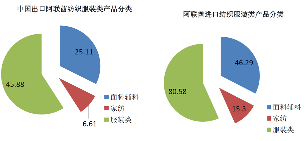 2013年中國(guó)向阿聯(lián)酋出口的77.6億美元的紡織服裝類(lèi)產(chǎn)品中,面料輔料類(lèi)產(chǎn)品占25.11億,家紡類(lèi)產(chǎn)品占6.61億,服裝類(lèi)產(chǎn)品占45.88億,可以看出中國(guó)向阿聯(lián)酋出口的產(chǎn)品還是以成衣為主。